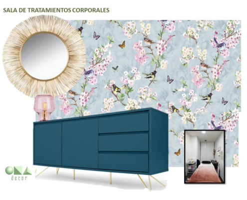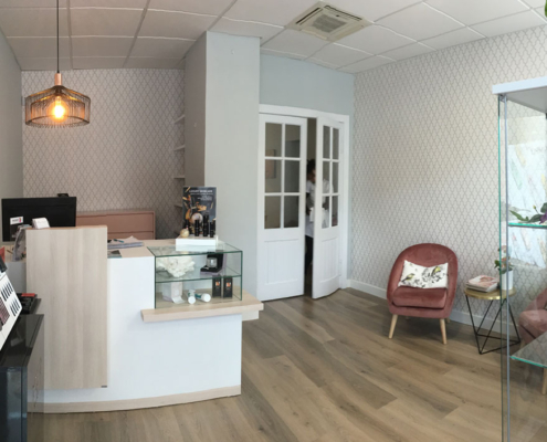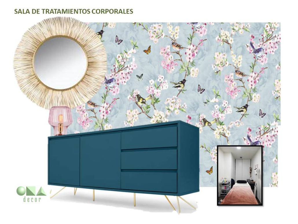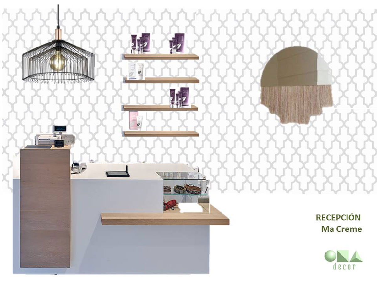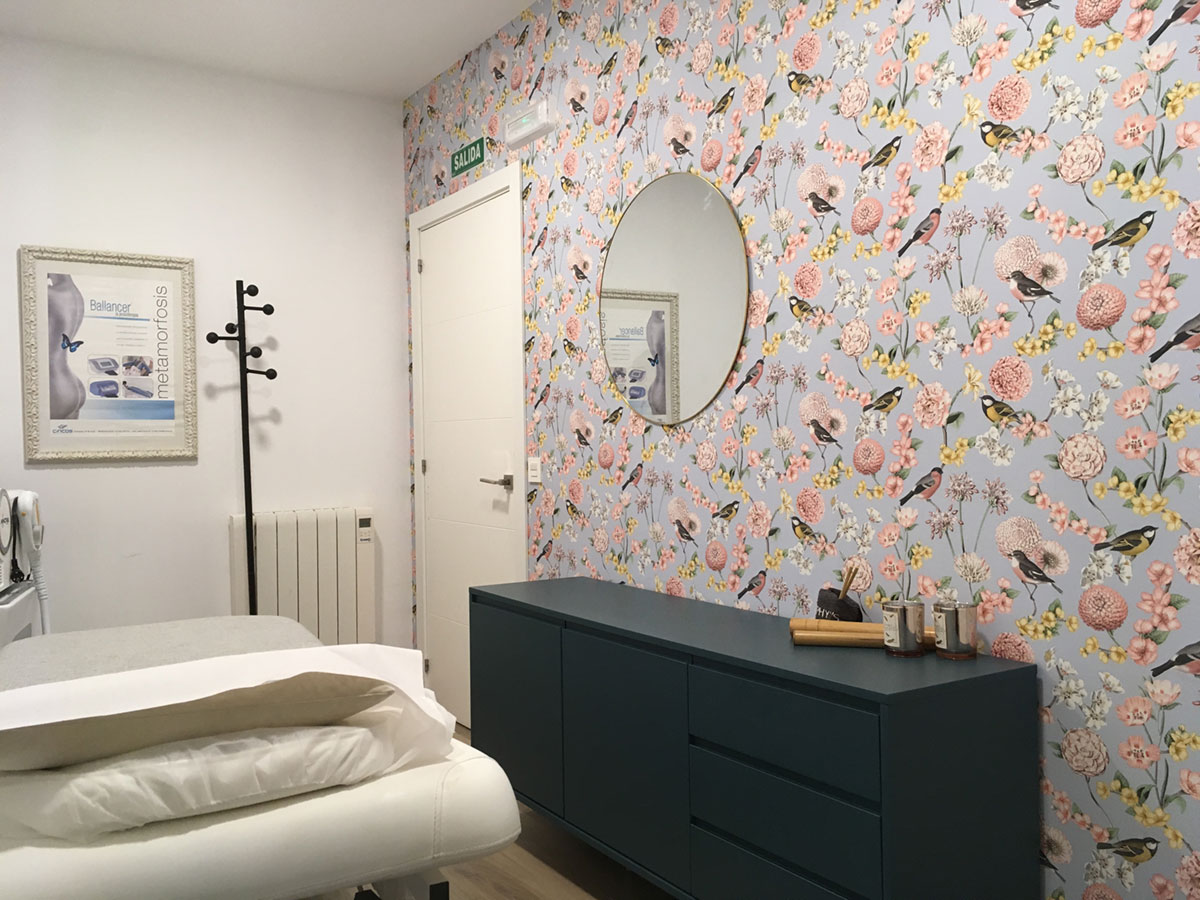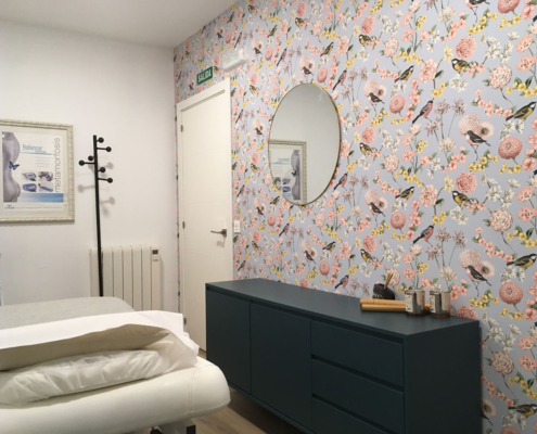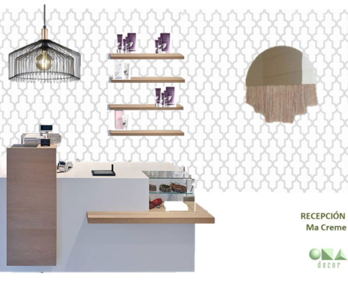 Diseño de interiores de ONAdecor para Ma Crème Esthétique, en Pamplona. Aportando maplitud visual y puntos de color con papeles pintados.