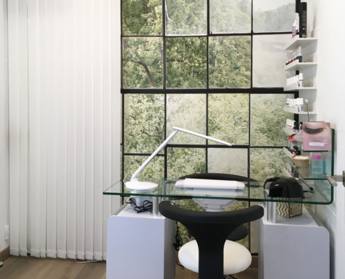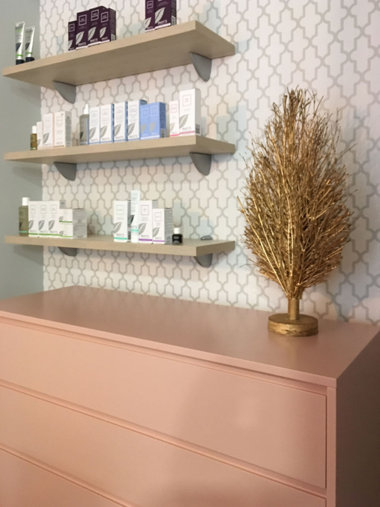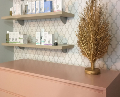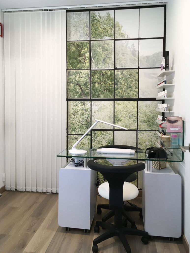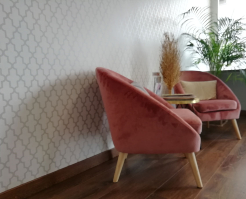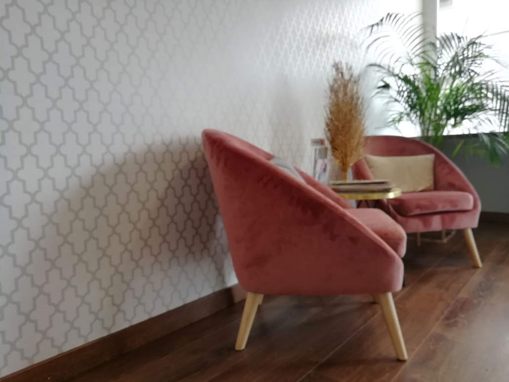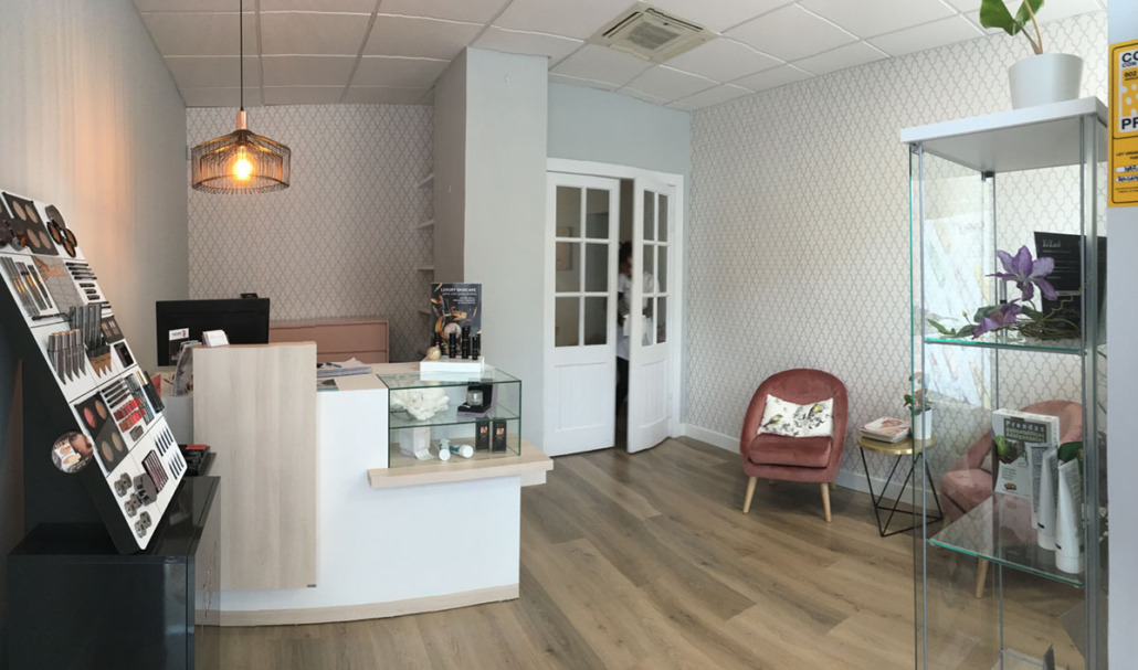Diseño de interiores de ONAdecor para Ma Crème Esthétique, en Pamplona. Aportando maplitud visual y puntos de color con papeles pintados.
